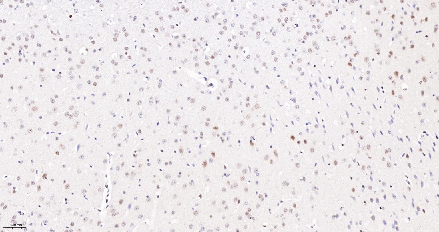 Paraformaldehyde-fixed, paraffin embedded Mouse Cerebrum; Antigen retrieval by boiling in sodium citrate buffer (pH6.0) for 15 min; The section was incubated with phospho-UBF1(Ser484) Monoclonal Antibody, Unconjugated (bsm-63010R) at 1:200 overnight at 4°C, followed by conjugation to the bs-0295G-HRP and DAB (C-0010) staining.