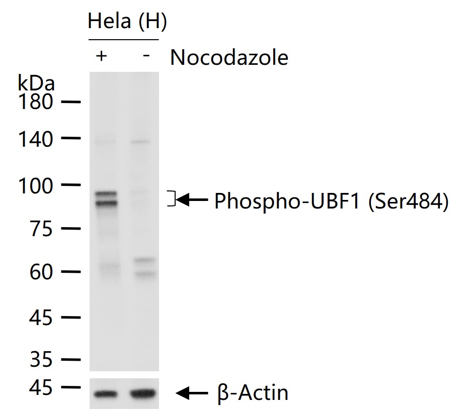 Hela (H) cells were treated with or without Nocodazole , 25 μg total protein per lane of cell lysates (see on figure) probed with Phospho-UBF1 (Ser484) monoclonal antibody, unconjugated (bsm-63010R) at 1:1000 dilution and 4°C overnight incubation. Followed by conjugated secondary antibody incubation at r.t. for 60 min.