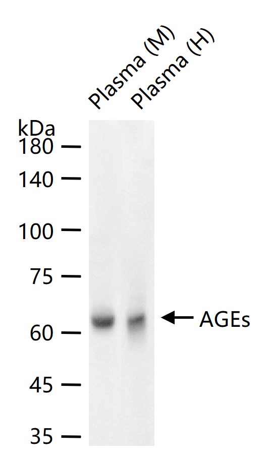 25 ug total protein per lane of various lysates (see on figure) probed with AGEs polyclonal antibody, unconjugated (bs-1158R) at 1:1000 dilution and 4°C overnight incubation. Followed by conjugated secondary antibody incubation at r.t. for 60 min.