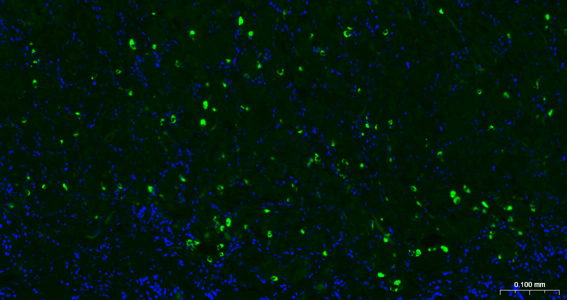 Paraformaldehyde-fixed, paraffin embedded Human Stomach; Antigen retrieval by boiling in sodium citrate buffer (pH6.0) for 15 min; The section was incubated with CHGA Polyclonal Antibody, Unconjugated (bs-0539R) at 1:200 overnight at 4°C. Followed by conjugated Goat Anti-Rabbit IgG antibody (green, bs-0295G-BF488), DAPI (blue, C02-04002) was used to stain the cell nuclei.