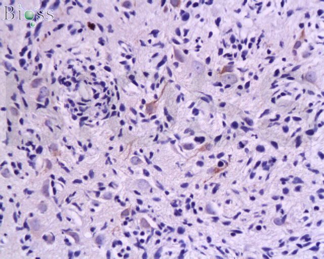 Tissue/cell: U-87MG cell; 4% Paraformaldehyde-fixed; Triton X-100 at room temperature for 20 min; Blocking buffer (normal goat serum, C-0005) at 37°C for 20 min; Antibody incubation with (MMP2)polyclonal Antibody, Unconjugated (bs-0412R) 1:100, 90 minutes at 37°C; followed by a conjugated Goat Anti-Rabbit IgG antibody at 37°C for 90 minutes, DAPI (blue, C02-04002) was used to stain the cell nuclei.