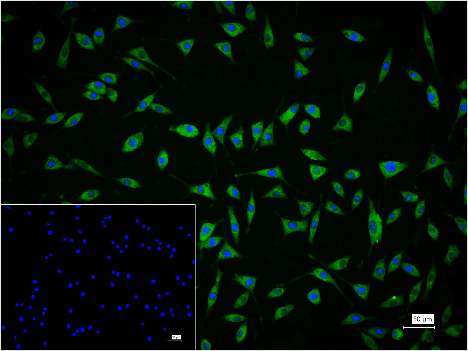 4% Paraformaldehyde-fixed SH-SY5Y (H) cell; Triton X-100 at r.t. for 20 min; Antibody incubation with (Tyrosine Hydroxylase) polyclonal Antibody, unconjugated (bs-0016R) 1:100, 90 min at 37°C; followed by BF488 conjugated Goat Anti-Rabbit IgG antibody (green, bs-60295G-BF488) at 37°C for 90 min, DAPI (blue, C02-04002) was used to stain the cell nuclei. PBS instead of the primary antibody was used as the blank control.