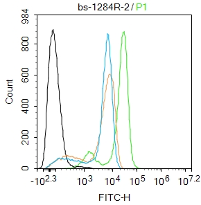 The cells were fixed with 2% paraformaldehyde (10 min) , then permeabilized with 90% ice-cold methanol for 30 min on ice. Antibody (bs-1284R, 1μg /1x10^6 cells) were incubated for 30 min on the ice, followed by 1 X PBS containing 0.5% BSA + 1 0% goat serum (15 min) to block non-specific protein-protein interactions. Then the Goat Anti-rabbit IgG/PE antibody was added into the blocking buffer mentioned above to react with the primary antibody of bs-1284R at 1/200 dilution for 30 min on ice. Acquisition of 20,000 events was performed.