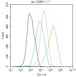 The MCF-7 (H) cells were incubated in 5%BSA to block non-specific protein-protein interactions (30 min at r.t.). Primary Antibody (green): Rabbit Anti-ZO-1 antibody (bs-1329R): 1 μg/10^6 cells; Secondary Antibody (white blue): Goat anti-Rabbit IgG-BF488 (bs-60295G-BF488): 1 μg/test. Isotype Control (orange): Rabbit IgG (bs-0295P). Blank control (black): PBS. Acquisition of 20,000 events was performed.