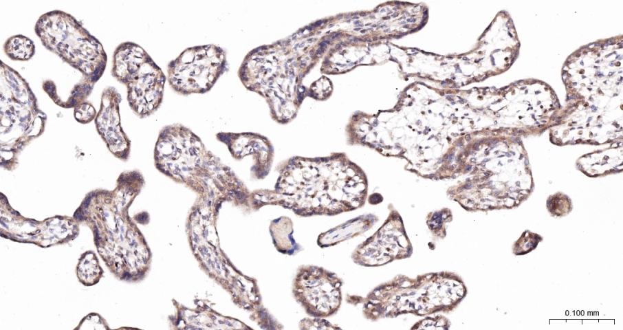 Paraformaldehyde-fixed, paraffin embedded Human Placenta; Antigen retrieval by boiling in sodium citrate buffer (pH6.0) for 15 min; The section was incubated with GPR30 Polyclonal Antibody, Unconjugated (bs-1380R) at 1:200 overnight at 4°C, followed by conjugation to the bs-0295G-HRP and DAB (C-0010) staining.