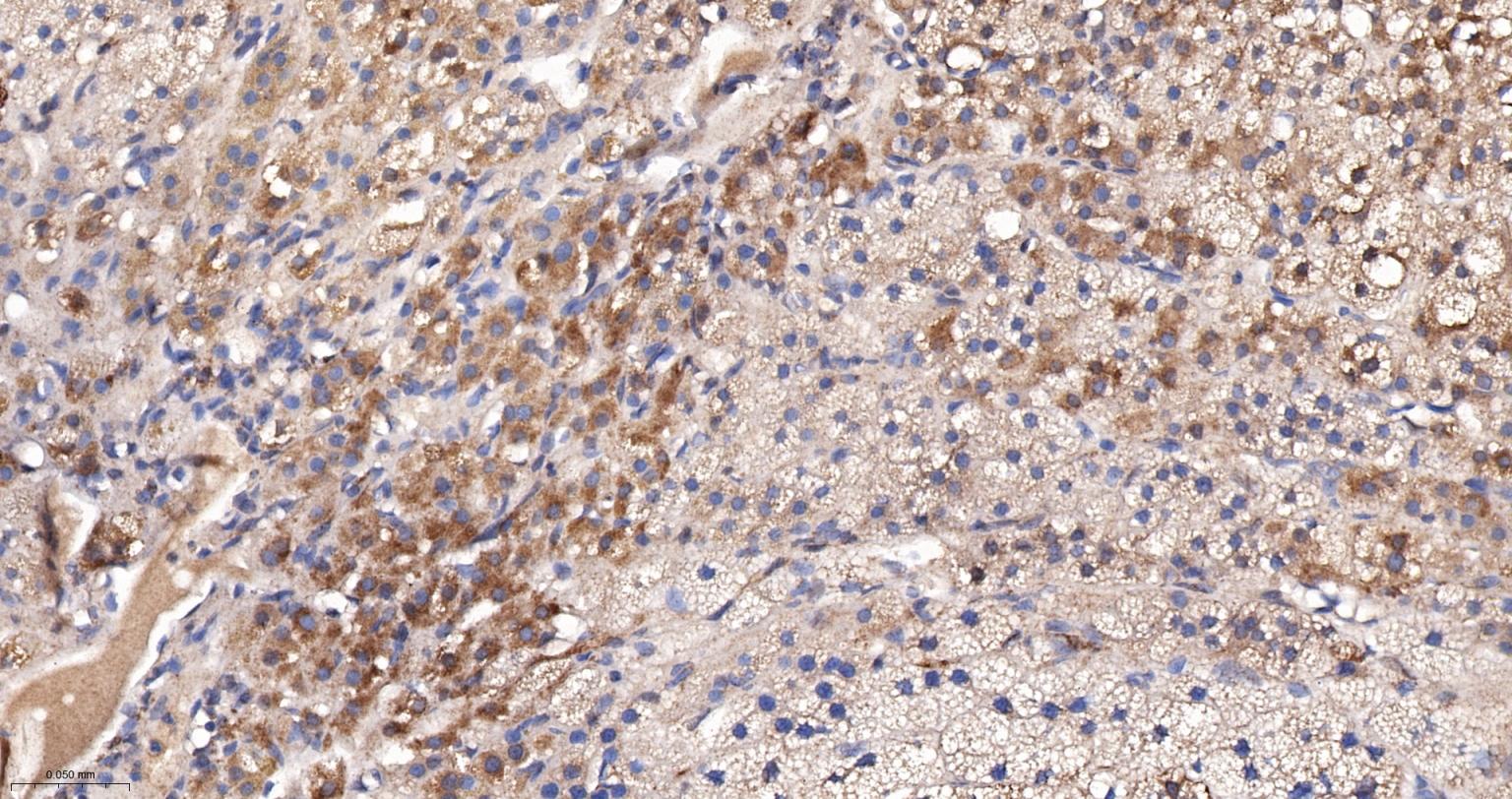 Paraformaldehyde-fixed, paraffin embedded (human adrenal gland); Antigen retrieval by boiling in sodium citrate buffer (pH6.0) for 15min; Block endogenous peroxidase by 3% hydrogen peroxide for 20 minutes; Blocking buffer (normal goat serum) at 37°C for 30min; Antibody incubation with (SREBP1) Polyclonal Antibody, Unconjugated (bs-1402R) at 1:200 overnight at 4°C, followed by operating according to SP Kit(Rabbit) (sp-0023) instructionsand DAB staining.
