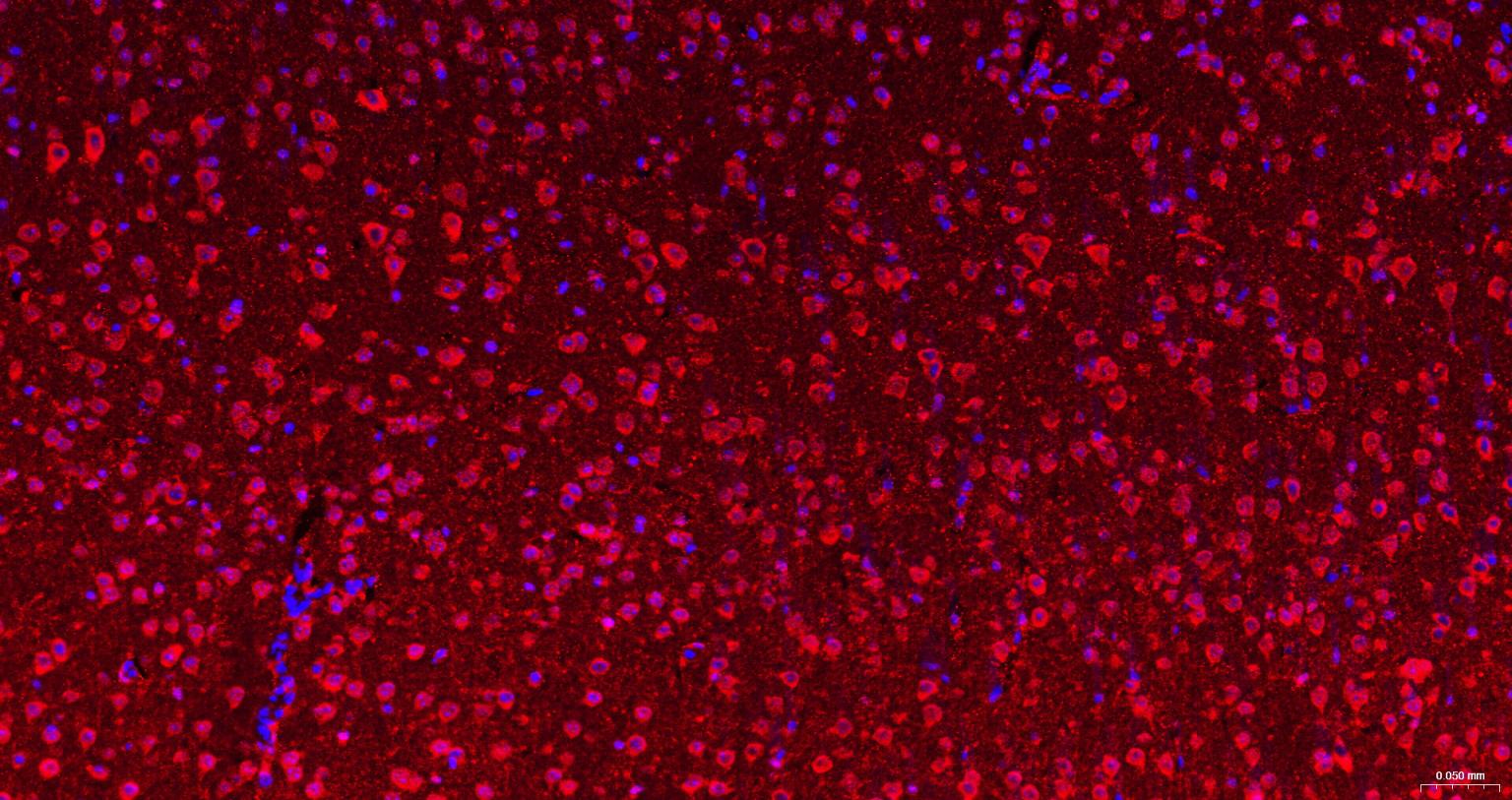 Paraformaldehyde-fixed, paraffin embedded Mouse Cerebrum; Antigen retrieval by boiling in sodium citrate buffer (pH6.0) for 15 min; The section was incubated with TLR3 Polyclonal Antibody, Unconjugated (bs-1444R) at 1:200 overnight at 4°C. Followed by conjugated Goat Anti-Rabbit IgG antibody (Red, bs-0295G-BF594), DAPI (blue, C02-04002) was used to stain the cell nuclei.