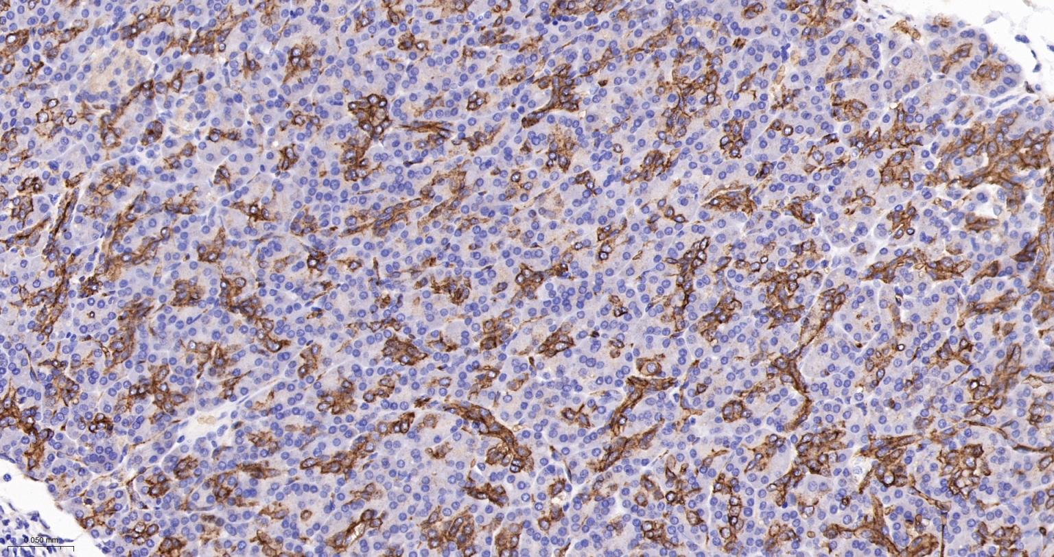 Paraformaldehyde-fixed, paraffin embedded Human Pancreas; Antigen retrieval by boiling in sodium citrate buffer (pH6.0) for 15 min; The section was incubated with AQP1 Polyclonal Antibody, Unconjugated (bs-1506R) at 1:200 overnight at 4°C, followed by conjugation to the bs-0295G-HRP and DAB (C-0010) staining.