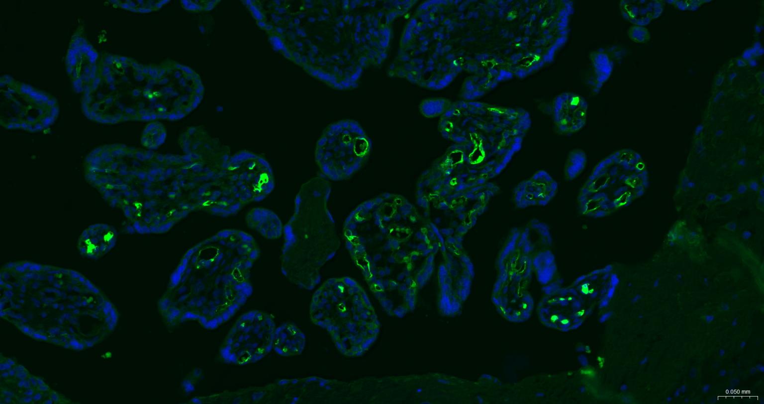 Paraformaldehyde-fixed, paraffin embedded Human Placenta; Antigen retrieval by boiling in sodium citrate buffer (pH6.0) for 15 min; The section was incubated with AFP(A2) Monoclonal Antibody, Unconjugated (bsm-1621M) at 1:200 overnight at 4°C. Followed by conjugated Goat Anti-Mouse IgG antibody (Green, bs-0296G-BF488), DAPI (blue, C02-04002) was used to stain the cell nuclei.