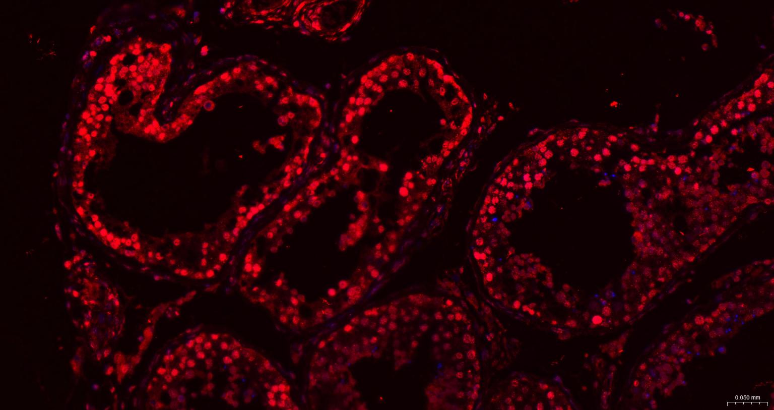 Paraformaldehyde-fixed, paraffin embedded Human Testicles; Antigen retrieval by boiling in sodium citrate buffer (pH6.0) for 15 min; The section was incubated with ERCC1 Polyclonal Antibody, Unconjugated (bs-1726R) at 1:200 overnight at 4°C. Followed by conjugated Goat Anti-Rabbit IgG antibody (Red, bs-0295G-BF594), DAPI (blue, C02-04002) was used to stain the cell nuclei.