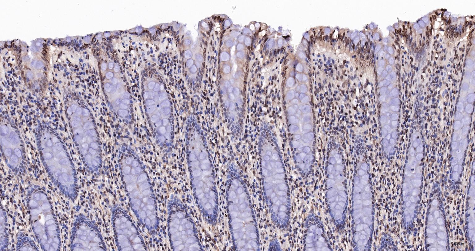 Paraformaldehyde-fixed, paraffin embedded Human Colon; Antigen retrieval by boiling in sodium citrate buffer (pH6.0) for 15 min; The section was incubated with phospho-Src (Tyr529) Polyclonal Antibody, Unconjugated (bs-1730R) at 1:200 overnight at 4°C, followed by conjugation to the bs-0295G-HRP and DAB (C-0010) staining.