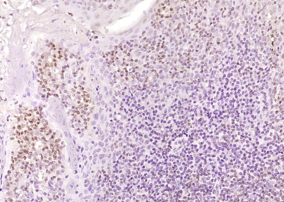 Paraformaldehyde-fixed, paraffin embedded (human tonsil); Antigen retrieval by boiling in sodium citrate buffer (pH6.0) for 15min; Block endogenous peroxidase by 3% hydrogen peroxide for 20 minutes; Blocking buffer (normal goat serum) at 37°C for 30min; Antibody incubation with (OGG1) Polyclonal Antibody, Unconjugated (bs-3687R ) at 1:200 overnight at 4°C, followed by operating according to SP Kit(Rabbit) (sp-0023) instructionsand DAB staining.