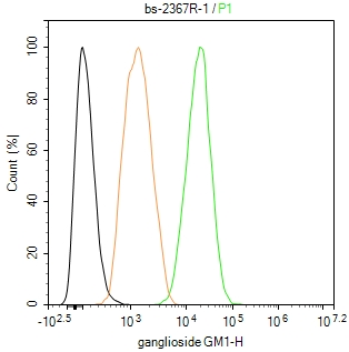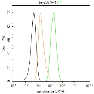 The Raji (H) cells were fixed with 4% PFA (10 min at r.t.) and then permeabilized with 90% ice-cold methanol for 20 min at -20℃,the cells then were incubated in 5%BSA to block non-specific protein-protein interactions (30 min at r.t.), followed by secondary antibody incubation for 40 min at room temperature. Primary Antibody (green):Rabbit Anti-ganglioside GM1 antibody (bs-23671R,1:100); Isotype Control (orange): Rabbit IgG (bs-0295P). Blank control (black): PBS. Acquisition of 20,000 events was performed.