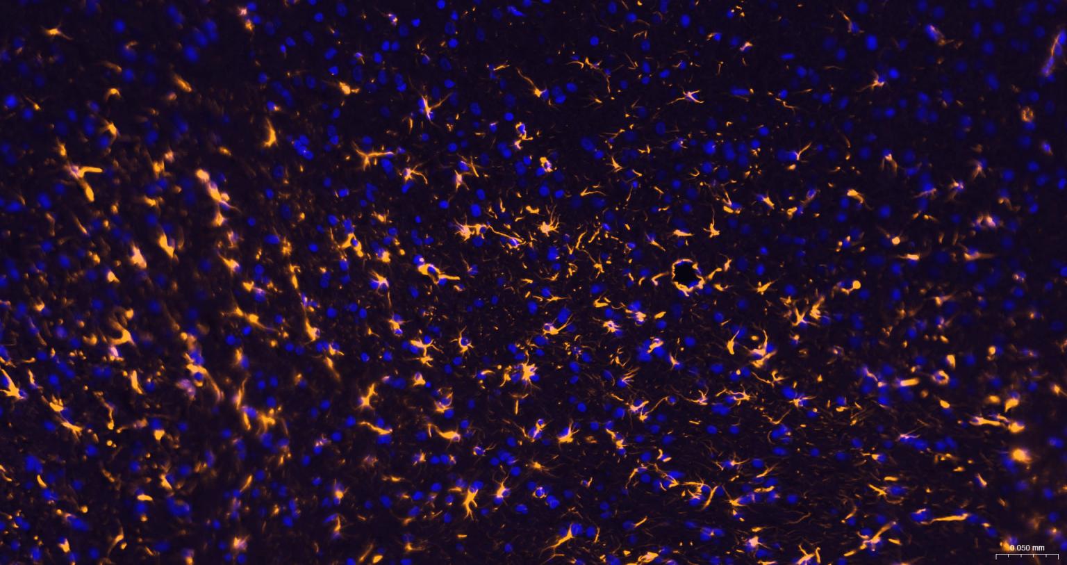 Paraformaldehyde-fixed, paraffin embedded rat brain; Antigen retrieval by boiling in sodium citrate buffer (pH6.0) for 15 min; incubation with GFAP antibody, Unconjugated(bsm-42001R) at 1:200 overnight at 4°C. Incubation with bs-0295G-Bio(Goat Anti-Rabbit IgG H&L, Biotin conjugated), followed by binding with bs-0437P-PE(orange) , DAPI (blue, C02-04002) was used to stain the cell nuclei.