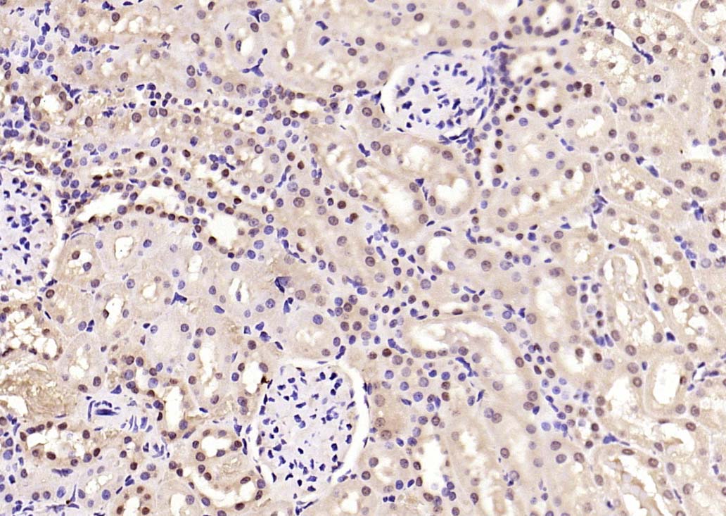 Paraformaldehyde-fixed, paraffin embedded (rat kidney); Antigen retrieval by boiling in sodium citrate buffer (pH6.0) for 15min; Block endogenous peroxidase by 3% hydrogen peroxide for 20 minutes; Blocking buffer (normal goat serum) at 37°C for 30min; Antibody incubation with (phospho-Smad3 (Ser213)) Polyclonal Antibody, Unconjugated (bs-5459R) at 1:200 overnight at 4°C, followed by operating according to SP Kit(Rabbit) (sp-0023) instructionsand DAB staining.