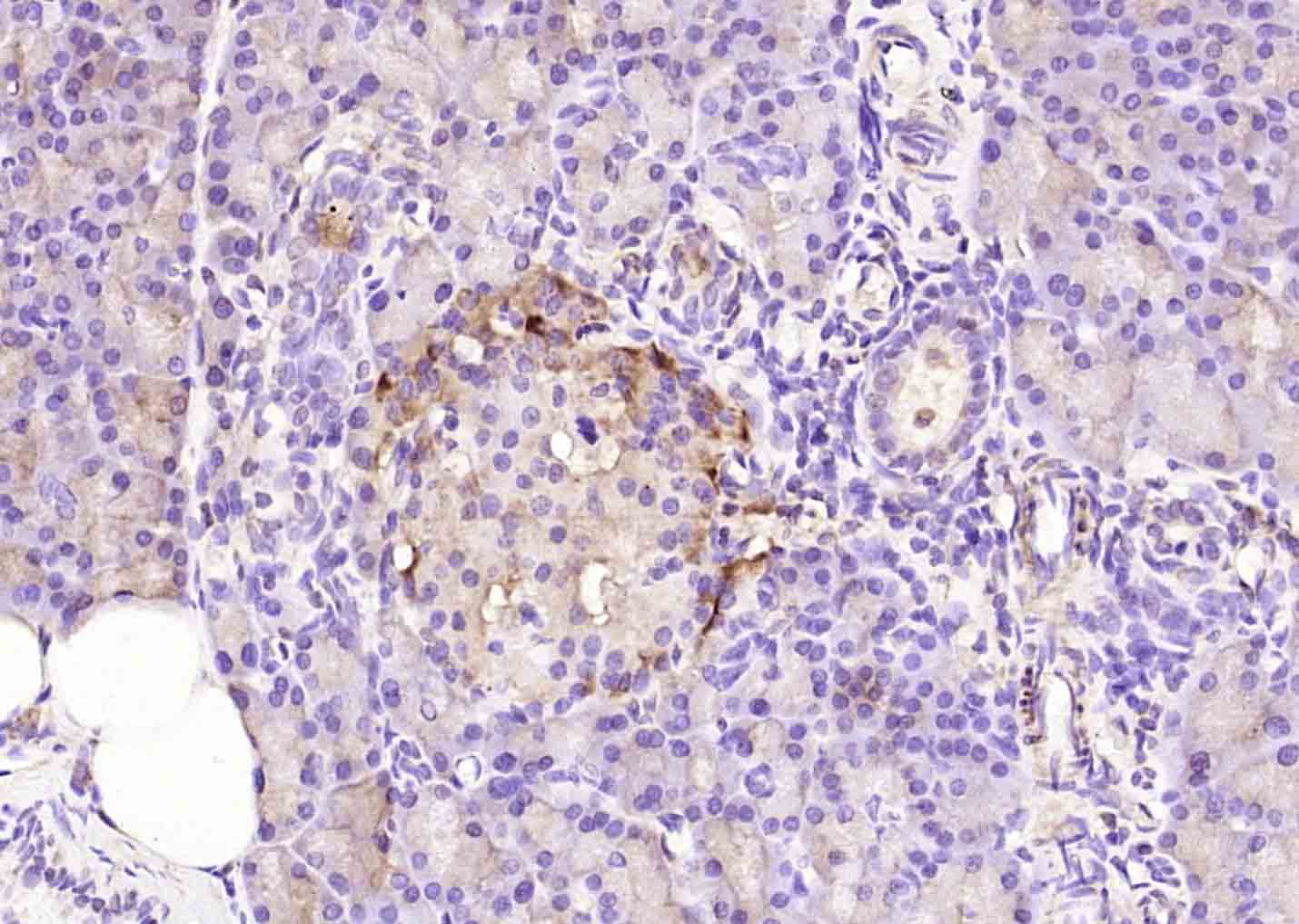 Paraformaldehyde-fixed, paraffin embedded (rat pancreas); Antigen retrieval by boiling in sodium citrate buffer (pH6.0) for 15min; Block endogenous peroxidase by 3% hydrogen peroxide for 20 minutes; Blocking buffer (normal goat serum) at 37°C for 30min; Antibody incubation with (ABAT) Polyclonal Antibody, Unconjugated (bs-4234R) at 1:200 overnight at 4°C, followed by operating according to SP Kit(Rabbit) (sp-0023) instructionsand DAB staining.