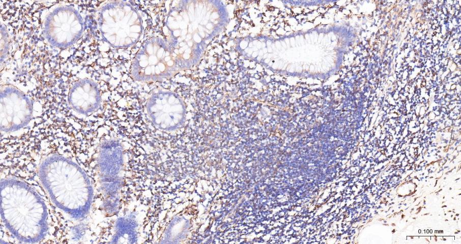 Paraformaldehyde-fixed, paraffin embedded Human Colon; Antigen retrieval by boiling in sodium citrate buffer (pH6.0) for 15 min; Antibody incubation with ADAM17 Polyclonal Antibody, Unconjugated (bs-4236R) at 1:200 overnight at 4°C, followed by conjugation to the bs-0295G-HRP and DAB (C-0010) staining.