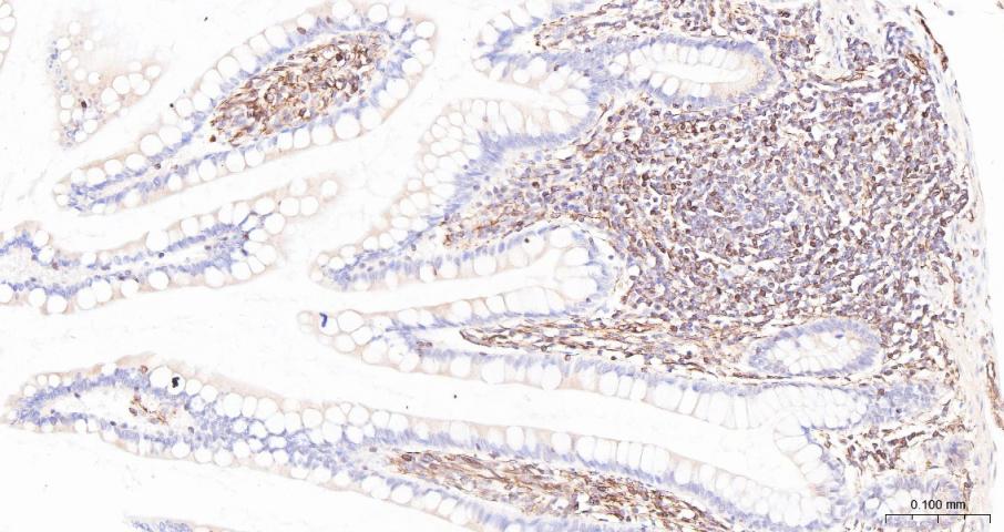 Paraformaldehyde-fixed, paraffin embedded Human Small Intestine; Antigen retrieval by boiling in sodium citrate buffer (pH6.0) for 15 min; Antibody incubation with ADAM17 Polyclonal Antibody, Unconjugated (bs-4236R) at 1:200 overnight at 4°C, followed by conjugation to the bs-0295G-HRP and DAB (C-0010) staining.