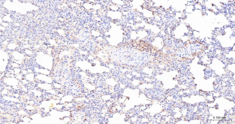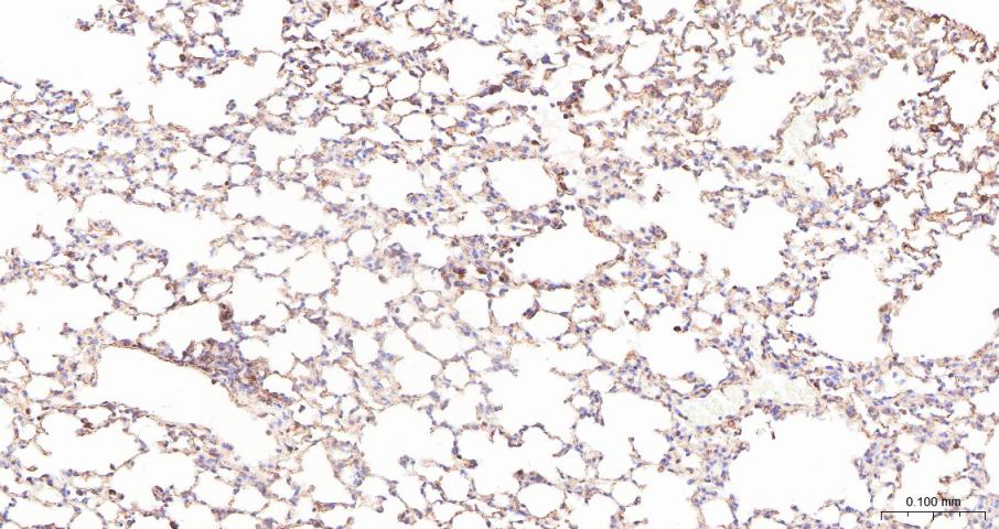 Paraformaldehyde-fixed, paraffin embedded Mouse Lung; Antigen retrieval by boiling in sodium citrate buffer (pH6.0) for 15 min; Antibody incubation with ADAM17 Polyclonal Antibody, Unconjugated (bs-4236R) at 1:200 overnight at 4°C, followed by conjugation to the bs-0295G-HRP and DAB (C-0010) staining.