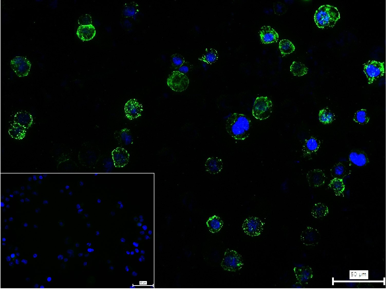 4% Paraformaldehyde-fixed Raji (H) cell; Antibody incubation with (ADAM17) polyclonal Antibody, unconjugated (bs-4236R) 1:100, 90 min at 37°C; followed by conjugated Goat Anti-Rabbit IgG antibody (green, bs-40295G-FITC) at 37°C for 90 min, DAPI (blue, C02-04002) was used to stain the cell nuclei. PBS instead of the primary antibody was used as the blank control.