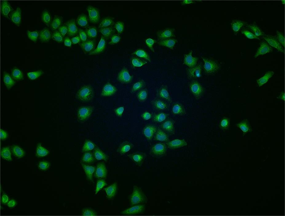 Hela cell; 4% Paraformaldehyde-fixed; Triton X-100 at room temperature for 20 min; Blocking buffer (normal goat serum, C-0005) at 37°C for 20 min; Antibody incubation with (Clathrin heavy chain) polyclonal Antibody, Unconjugated (bs-2932R) 1:50, 90 minutes at 37°C; followed by a conjugated Goat Anti-Rabbit IgG antibody at 37°C for 90 minutes, DAPI (blue, C02-04002) was used to stain the cell nuclei.