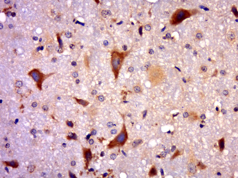 Paraformaldehyde-fixed, paraffin embedded (rat brain); Antigen retrieval by boiling in sodium citrate buffer (pH6.0) for 15min; Block endogenous peroxidase by 3% hydrogen peroxide for 20 minutes; Blocking buffer (normal goat serum) at 37°C for 30min; Antibody incubation with (RAB8A) Polyclonal Antibody, Unconjugated (bs-6176R) at 1:500 overnight at 4°C, followed by a conjugated secondary (sp-0023) for 20 minutes and DAB staining.