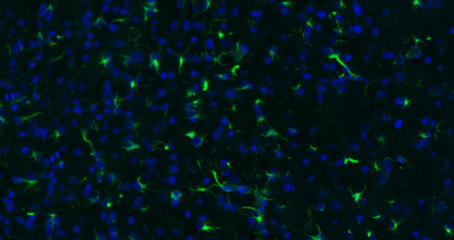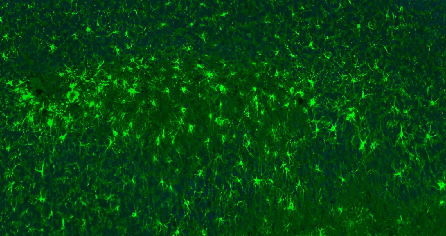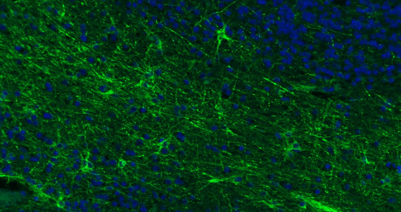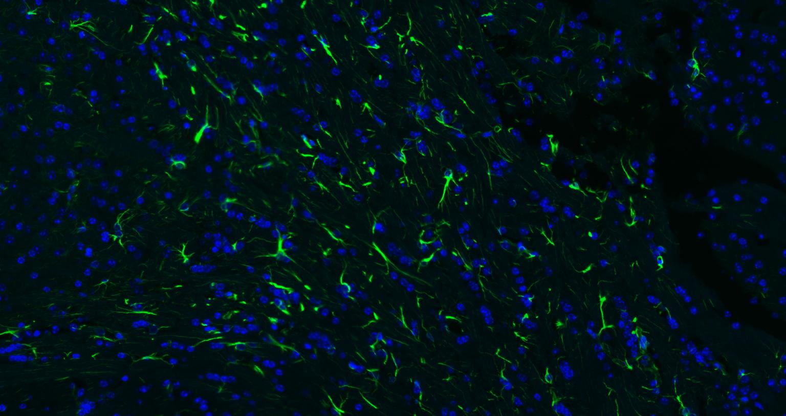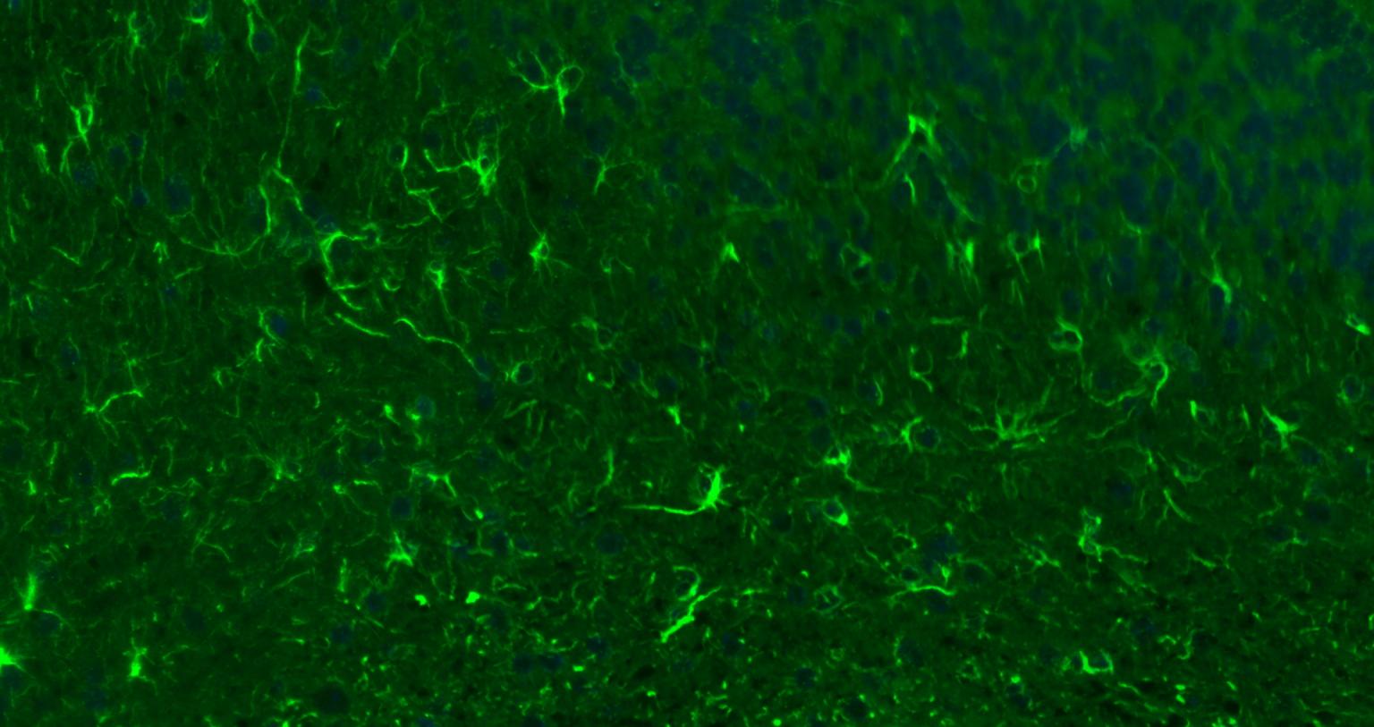 Paraformaldehyde-fixed, paraffin embedded Mouse Cerebrum; Antigen retrieval by boiling in sodium citrate buffer (pH6.0) for 15 min; The section was incubated with GFAP Polyclonal Antibody, Unconjugated (bs-0199R) at 1:100 overnight at 4°C. Followed by conjugated Goat Anti-Rabbit IgG antibody (green, bs-0295G-FITC), DAPI (blue, C02-04002) was used to stain the cell nuclei.