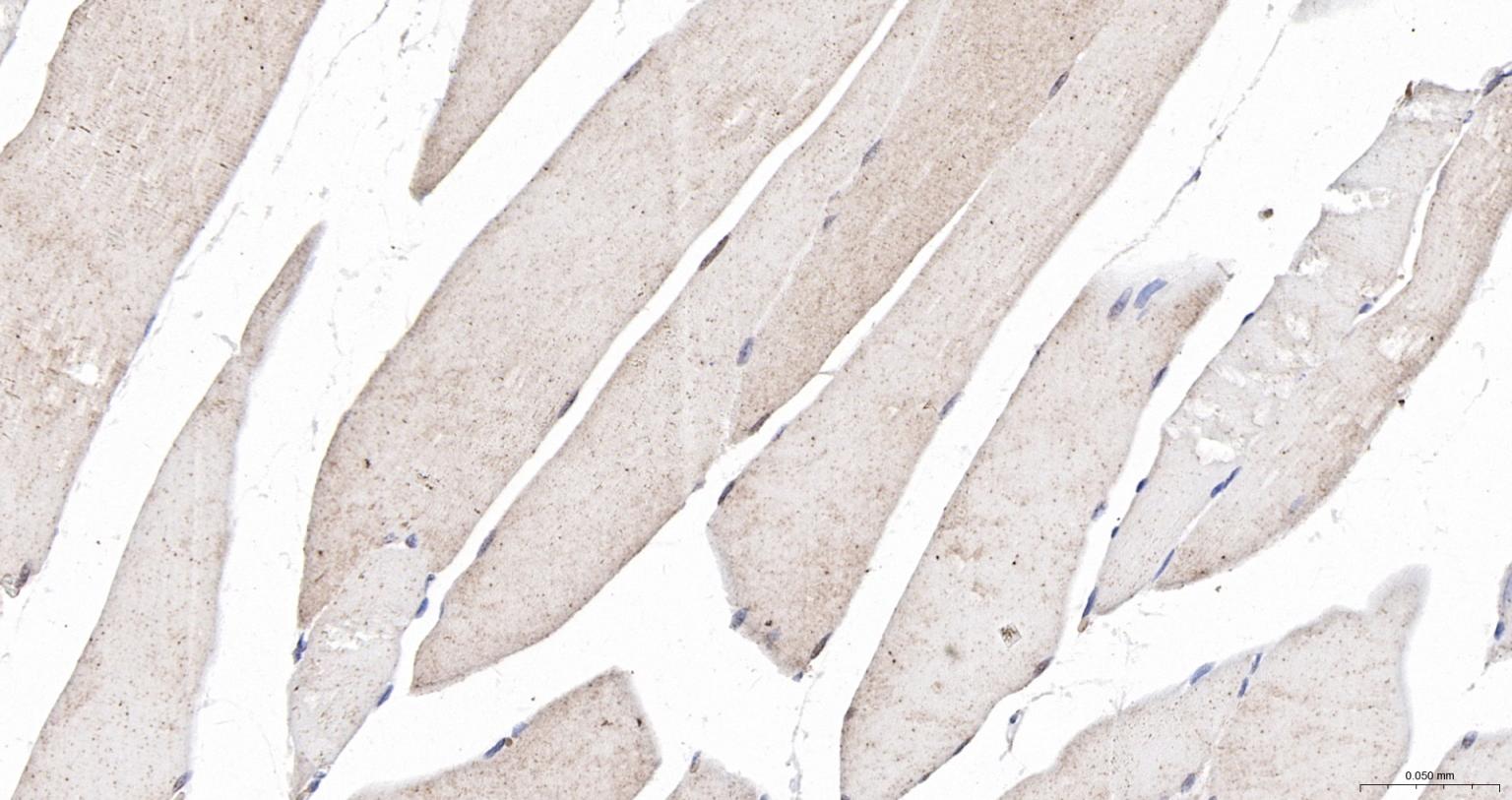 Paraformaldehyde-fixed, paraffin embedded Mouse Skeletal muscle; Antigen retrieval by boiling in sodium citrate buffer (pH6.0) for 15 min; The section was incubated with CSEN Polyclonal Antibody, Unconjugated (bs-9853R) at 1:200 overnight at 4°C, followed by conjugation to the bs-0295G-HRP and DAB (C-0010) staining.