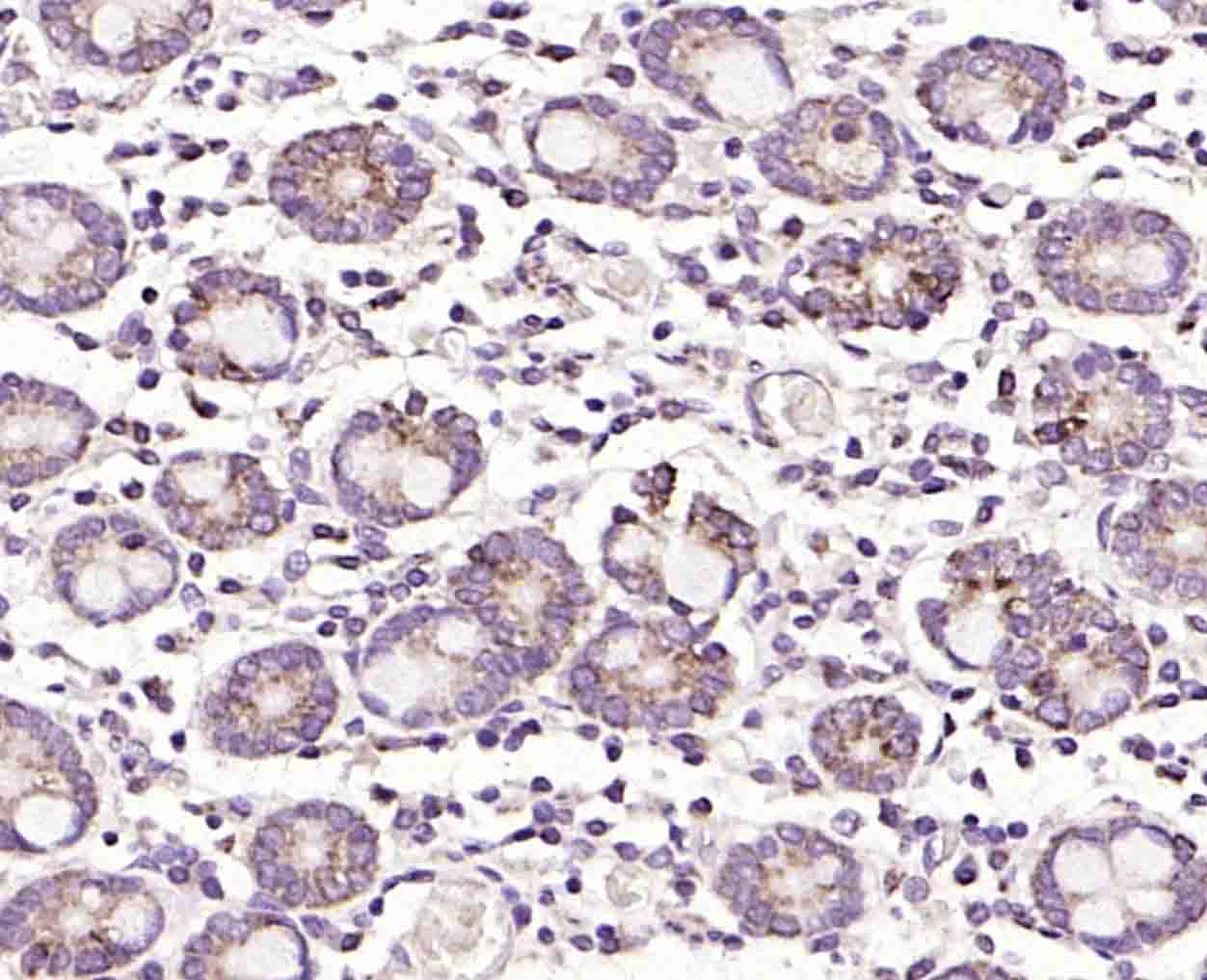 Paraformaldehyde-fixed, paraffin embedded (rat duodenum); Antigen retrieval by boiling in sodium citrate buffer (pH6.0) for 15min; Block endogenous peroxidase by 3% hydrogen peroxide for 20 minutes; Blocking buffer (normal goat serum) at 37°C for 30min; Incubation with (amine Oxidase B Rabbit pAb) Polyclonal Antibody, Unconjugated (bs-11297R) at 1:200 overnight at 4°C, followed by operating according to SP Kit(Rabbit) (sp-0023) instructionsand DAB staining.
