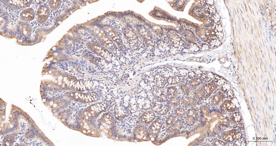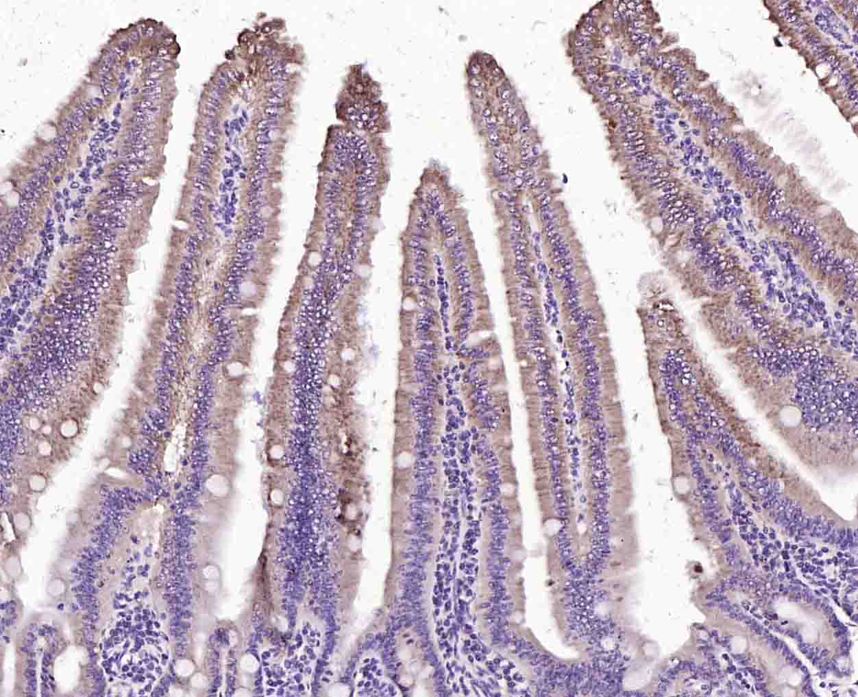Paraformaldehyde-fixed, paraffin embedded (mouse duodenum); Antigen retrieval by boiling in sodium citrate buffer (pH6.0) for 15min; Block endogenous peroxidase by 3% hydrogen peroxide for 20 minutes; Blocking buffer (normal goat serum) at 37°C for 30min; Incubation with (amine Oxidase B Rabbit pAb) Polyclonal Antibody, Unconjugated (bs-11297R) at 1:200 overnight at 4°C, followed by operating according to SP Kit(Rabbit) (sp-0023) instructionsand DAB staining.