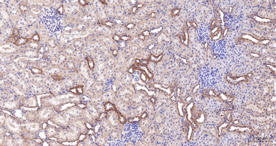 Paraformaldehyde-fixed, paraffin embedded Rat Kidney; Antigen retrieval by boiling in sodium citrate buffer (pH6.0) for 15 min; The section was incubated with Monoamine Oxidase B Polyclonal Antibody, Unconjugated (bs-11297R) at 1:200 overnight at 4°C, followed by conjugation to the bs-0295G-HRP and DAB (C-0010) staining.