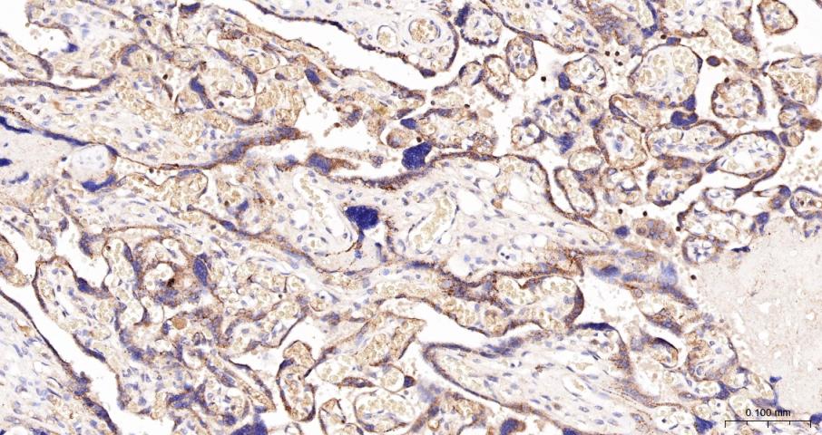 Paraformaldehyde-fixed, paraffin embedded Human Placenta; Antigen retrieval by boiling in sodium citrate buffer (pH6.0) for 15 min; The section was incubated with Monoamine Oxidase B Polyclonal Antibody, Unconjugated (bs-11297R) at 1:200 overnight at 4°C, followed by conjugation to the bs-0295G-HRP and DAB (C-0010) staining.