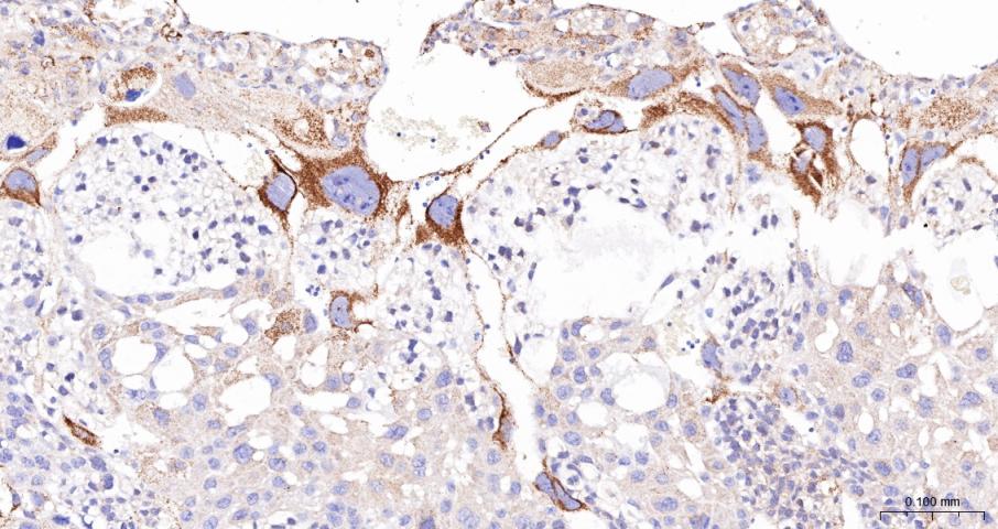 Paraformaldehyde-fixed, paraffin embedded (human kidney carcinoma); Antigen retrieval by boiling in sodium citrate buffer (pH6.0) for 15min; Block endogenous peroxidase by 3% hydrogen peroxide for 20 minutes; Blocking buffer (normal goat serum) at 37°C for 30min; Incubation with (amine Oxidase B Rabbit pAb) Polyclonal Antibody, Unconjugated (bs-11297R) at 1:200 overnight at 4°C, followed by operating according to SP Kit(Rabbit) (sp-0023) instructionsand DAB staining.