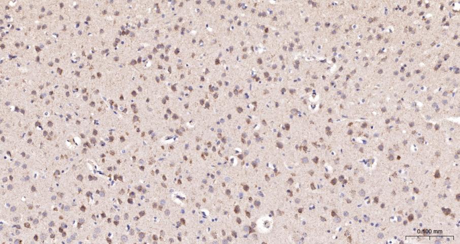 Paraformaldehyde-fixed, paraffin embedded Rat Cerebrum; Antigen retrieval by boiling in sodium citrate buffer (pH6.0) for 15 min; The section was incubated with Monoamine Oxidase B Polyclonal Antibody, Unconjugated (bs-11297R) at 1:200 overnight at 4°C, followed by conjugation to the bs-0295G-HRP and DAB (C-0010) staining.