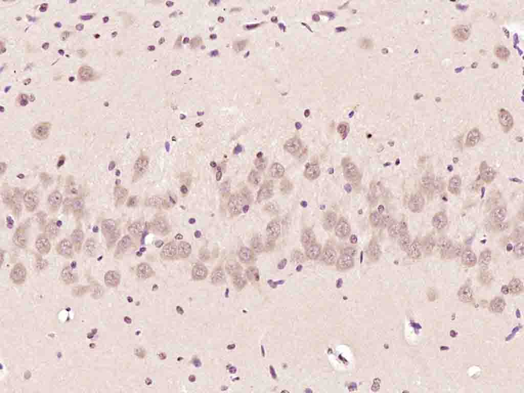 Paraformaldehyde-fixed, paraffin embedded (mouse brain); Antigen retrieval by boiling in sodium citrate buffer (pH6.0) for 15min; Block endogenous peroxidase by 3% hydrogen peroxide for 20 minutes; Blocking buffer (normal goat serum) at 37°C for 30min; Antibody incubation with (phospho-Ataxin 1 (Ser775)) Polyclonal Antibody, Unconjugated (bs-12534R) at 1:200 overnight at 4°C, followed by operating according to SP Kit(Rabbit) (sp-0023) instructionsand DAB staining.
