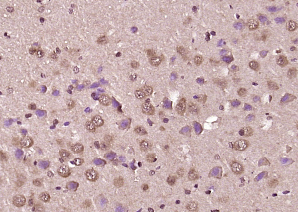 Paraformaldehyde-fixed, paraffin embedded (rat brain); Antigen retrieval by boiling in sodium citrate buffer (pH6.0) for 15min; Block endogenous peroxidase by 3% hydrogen peroxide for 20 minutes; Blocking buffer (normal goat serum) at 37°C for 30min; Antibody incubation with (AZI1) Polyclonal Antibody, Unconjugated (bs-12977R) at 1:200 overnight at 4°C, followed by operating according to SP Kit(Rabbit) (sp-0023) instructionsand DAB staining.