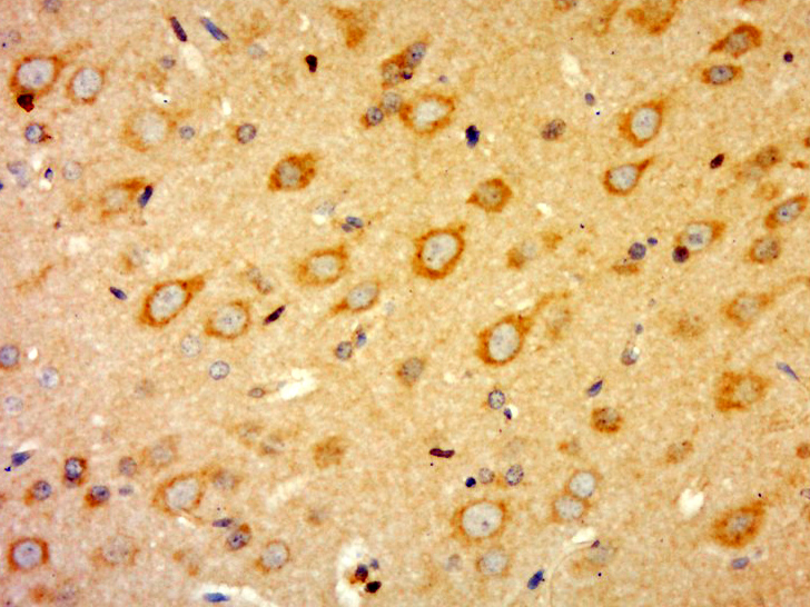Paraformaldehyde-fixed, paraffin embedded (rat brain); Antigen retrieval by boiling in sodium citrate buffer (pH6.0) for 15min; Block endogenous peroxidase by 3% hydrogen peroxide for 20 minutes; Blocking buffer (normal goat serum) at 37°C for 30min; Antibody incubation with (GNA15) Polyclonal Antibody, Unconjugated (bs-13248R) at 1:500 overnight at 4°C, followed by a conjugated secondary (sp-0023) for 20 minutes and DAB staining.