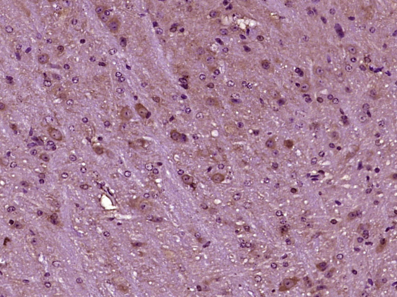 Paraformaldehyde-fixed, paraffin embedded (Mouse brain); Antigen retrieval by boiling in sodium citrate buffer (pH6.0) for 15min; Block endogenous peroxidase by 3% hydrogen peroxide for 20 minutes; Blocking buffer (normal goat serum) at 37°C for 30min; Antibody incubation with (MAP2K1IP1) Polyclonal Antibody, Unconjugated (bs-13688R) at 1:400 overnight at 4°C, followed by operating according to SP Kit(Rabbit) (sp-0023) instructionsand DAB staining.
