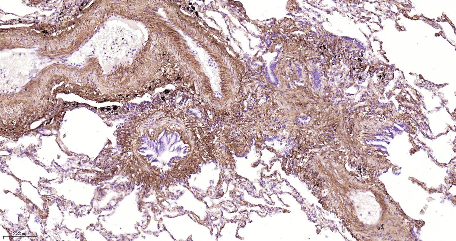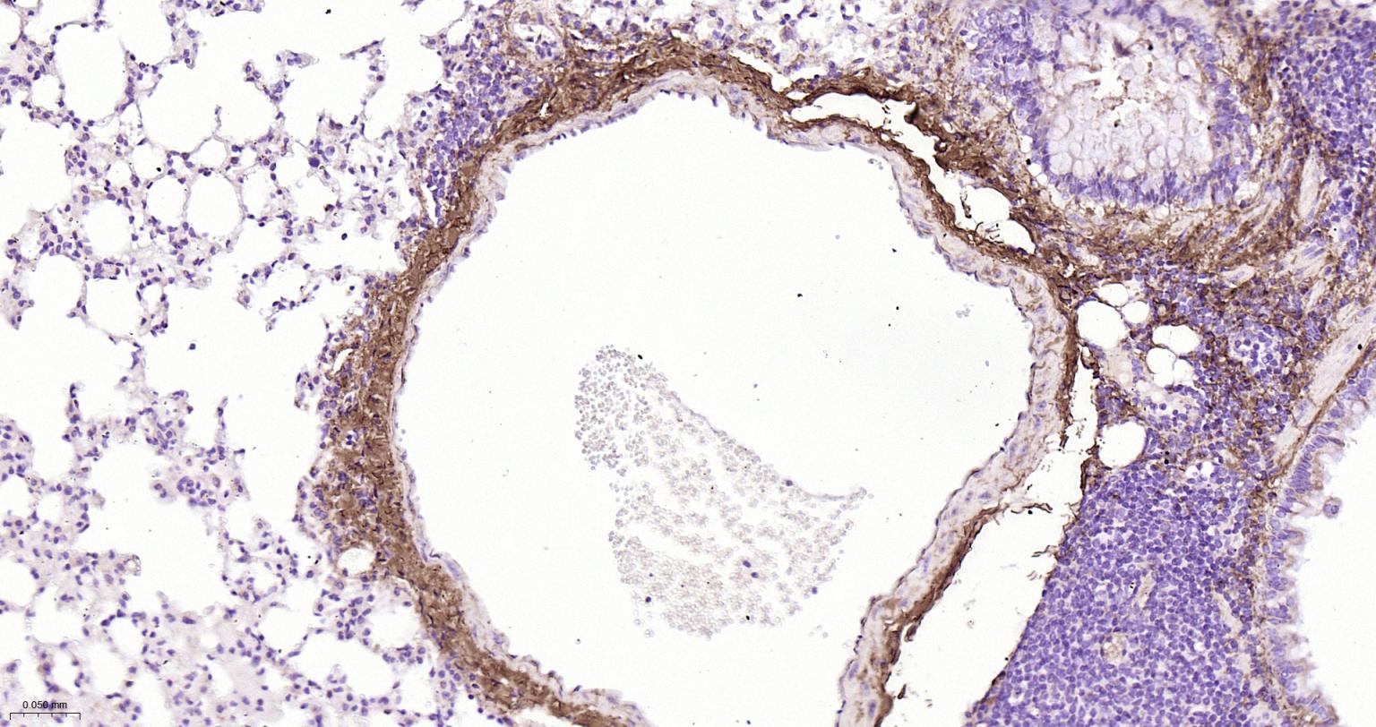 Paraformaldehyde-fixed, paraffin embedded Mouse Lung; Antigen retrieval by boiling in sodium citrate buffer (pH6.0) for 15 min; The section was incubated with Collagen I Polyclonal Antibody, Unconjugated (bs-10423R) at 1:800 overnight at 4°C, followed by conjugation to the bs-0295G-HRP and DAB (C-0010) staining.