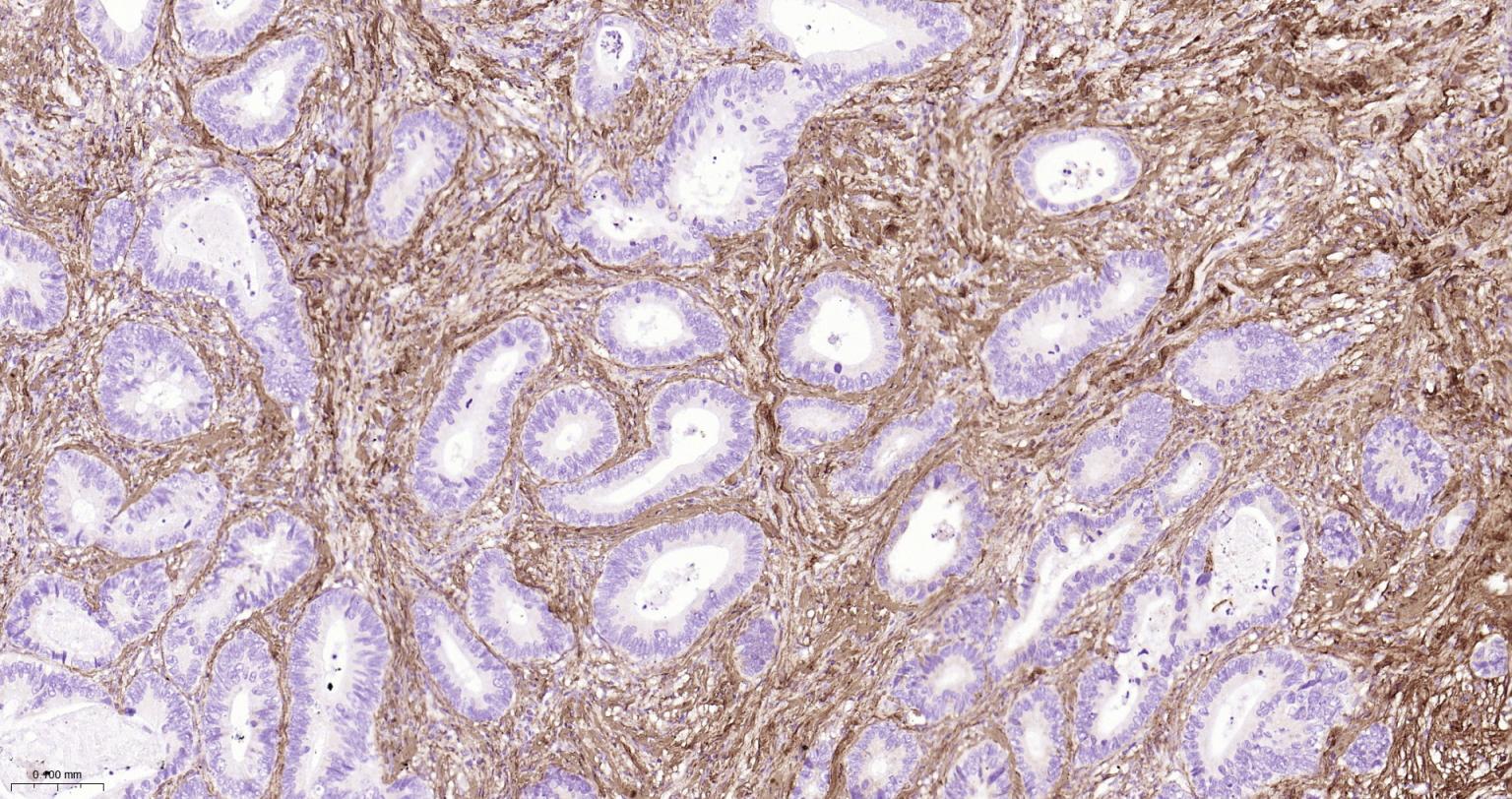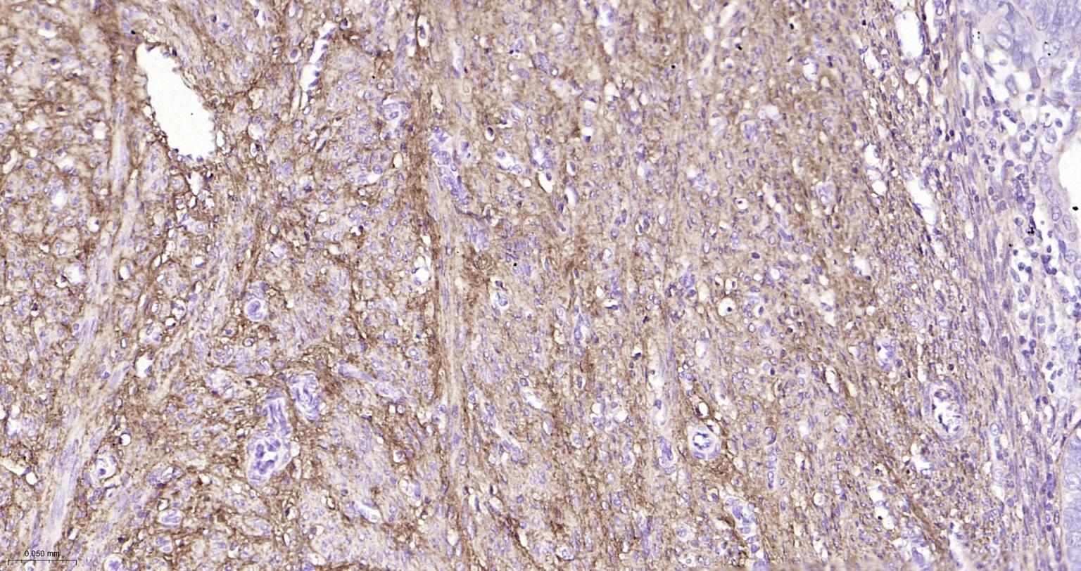 Paraformaldehyde-fixed, paraffin embedded Human Endometrial Cancer; Antigen retrieval by boiling in sodium citrate buffer (pH6.0) for 15 min; The section was incubated with Collagen I Polyclonal Antibody, Unconjugated (bs-10423R) at 1:800 overnight at 4°C, followed by conjugation to the bs-0295G-HRP and DAB (C-0010) staining.