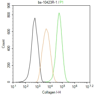 The U-87 MG (H) cells were fixed with 4% PFA (10 min at r.t.) and then permeabilized with 90% ice-cold methanol for 20 min at -20℃,the cells then were incubated in 5%BSA to block non-specific protein-protein interactions (30 min at r.t.), followed by secondary antibody incubation for 40 min at room temperature. Primary Antibody (green):Rabbit Anti-Collagen I antibody (bs-10423R,1:100); Isotype Control (orange): Rabbit IgG (bs-0295P). Blank control (black): PBS. Acquisition of 20,000 events was performed.