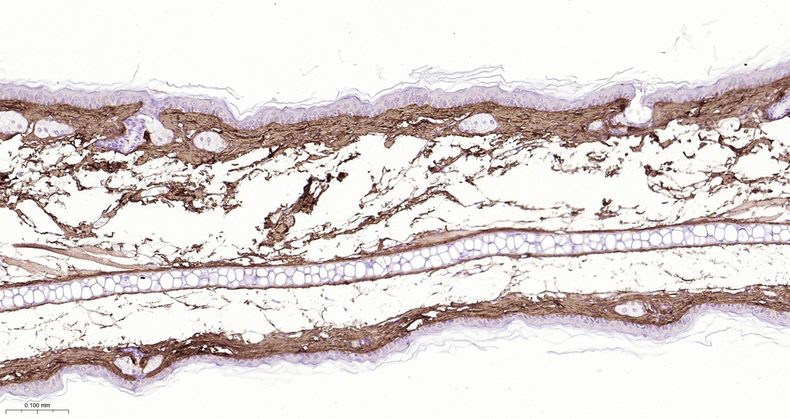 Paraformaldehyde-fixed, paraffin embedded Mouse Skin; Antigen retrieval by boiling in sodium citrate buffer (pH6.0) for 15 min; The section was incubated with Collagen I Polyclonal Antibody, Unconjugated (bs-10423R) at 1:800 overnight at 4°C, followed by conjugation to the bs-0295G-HRP and DAB (C-0010) staining.