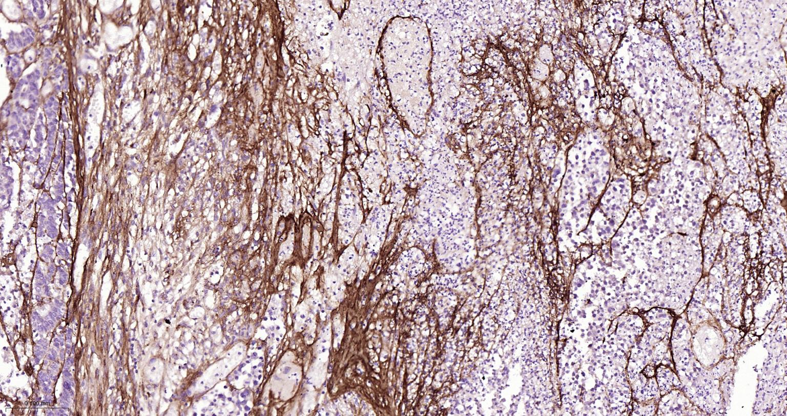 Paraformaldehyde-fixed, paraffin embedded Human Colon Cancer; Antigen retrieval by boiling in sodium citrate buffer (pH6.0) for 15 min; The section was incubated with Collagen I Polyclonal Antibody, Unconjugated (bs-10423R) at 1:800 overnight at 4°C, followed by conjugation to the bs-0295G-HRP and DAB (C-0010) staining.