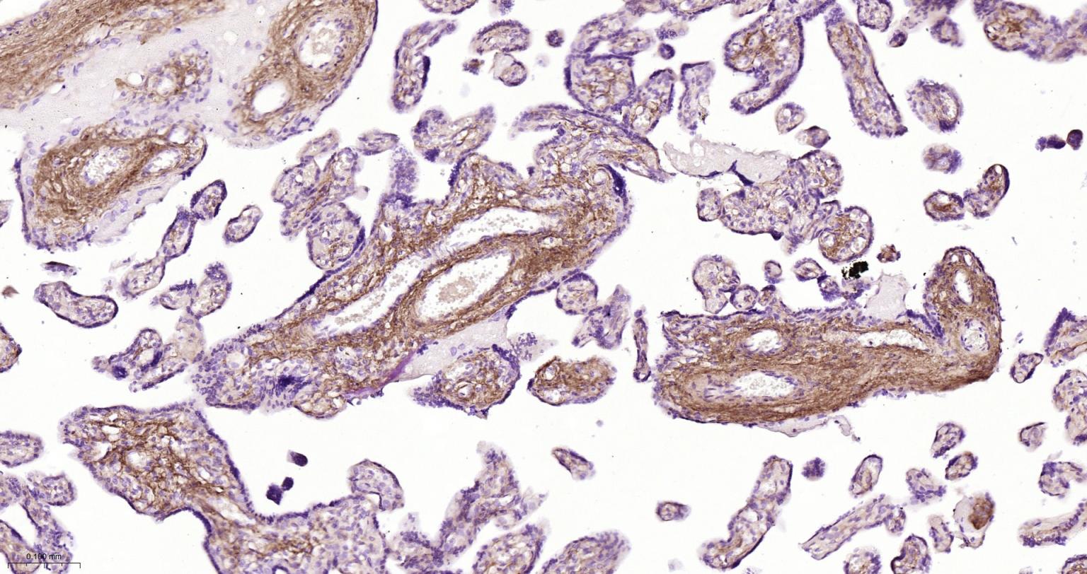 Paraformaldehyde-fixed, paraffin embedded Human Placenta; Antigen retrieval by boiling in sodium citrate buffer (pH6.0) for 15 min; The section was incubated with Collagen I Polyclonal Antibody, Unconjugated (bs-10423R) at 1:800 overnight at 4°C, followed by conjugation to the bs-0295G-HRP and DAB (C-0010) staining.
