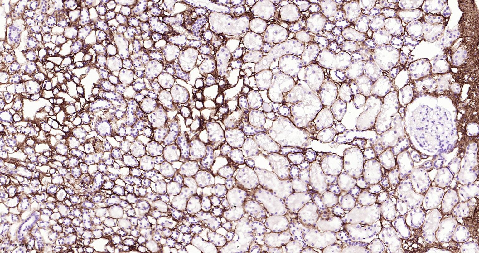 Paraformaldehyde-fixed, paraffin embedded Human Kidney; Antigen retrieval by boiling in sodium citrate buffer (pH6.0) for 15 min; The section was incubated with Collagen I Polyclonal Antibody, Unconjugated (bs-10423R) at 1:800 overnight at 4°C, followed by conjugation to the bs-0295G-HRP and DAB (C-0010) staining.