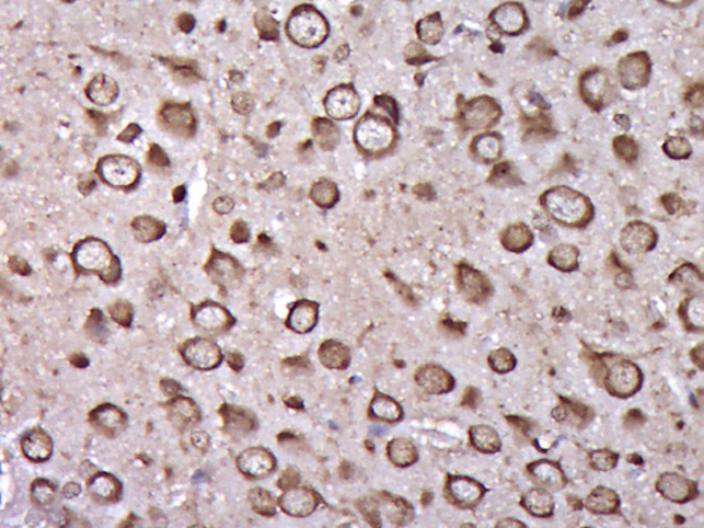Paraformaldehyde-fixed, paraffin embedded (Rat brain); Antigen retrieval by boiling in sodium citrate buffer (pH6.0) for 15min; Block endogenous peroxidase by 3% hydrogen peroxide for 20 minutes; Blocking buffer (normal goat serum) at 37°C for 30min; Antibody incubation with (Tropomodulin 3) Polyclonal Antibody, Unconjugated (bs-17156R) at 1:400 overnight at 4°C, followed by operating according to SP Kit(Rabbit) (sp-0023) instructions and DAB staining.