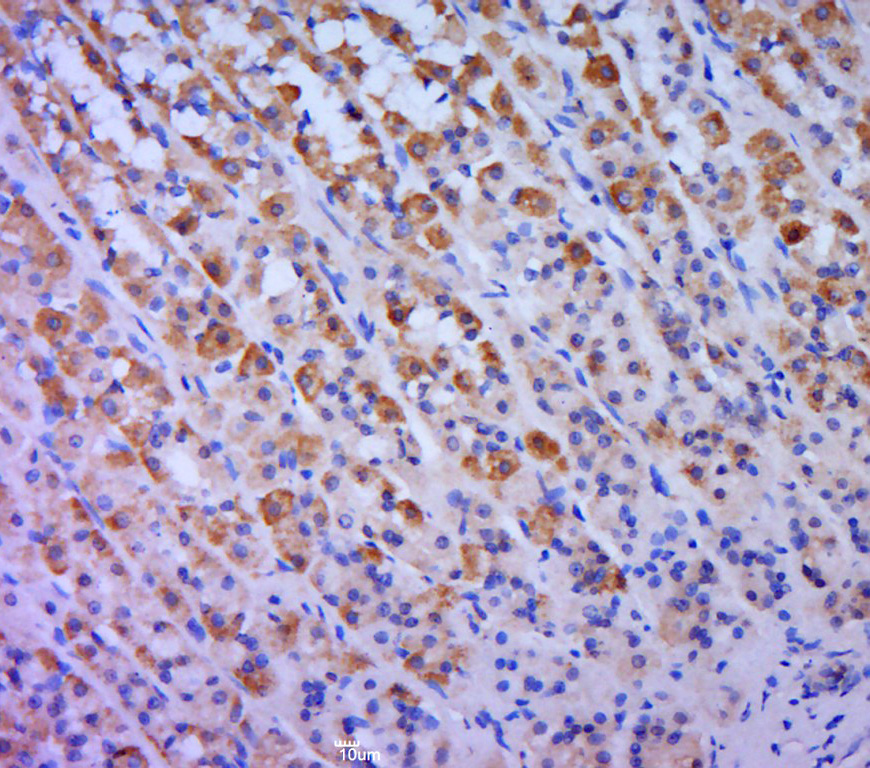 Paraformaldehyde-fixed, paraffin embedded (rat stomach tissue); Antigen retrieval by boiling in sodium citrate buffer (pH6.0) for 15min; Block endogenous peroxidase by 3% hydrogen peroxide for 20 minutes; Blocking buffer (normal goat serum) at 37°C for 30min; Antibody incubation with (PDE4A) Polyclonal Antibody, Unconjugated (bs-10140R) at 1:400 overnight at 4°C, followed by a conjugated secondary (sp-0023) for 20 minutes and DAB staining.