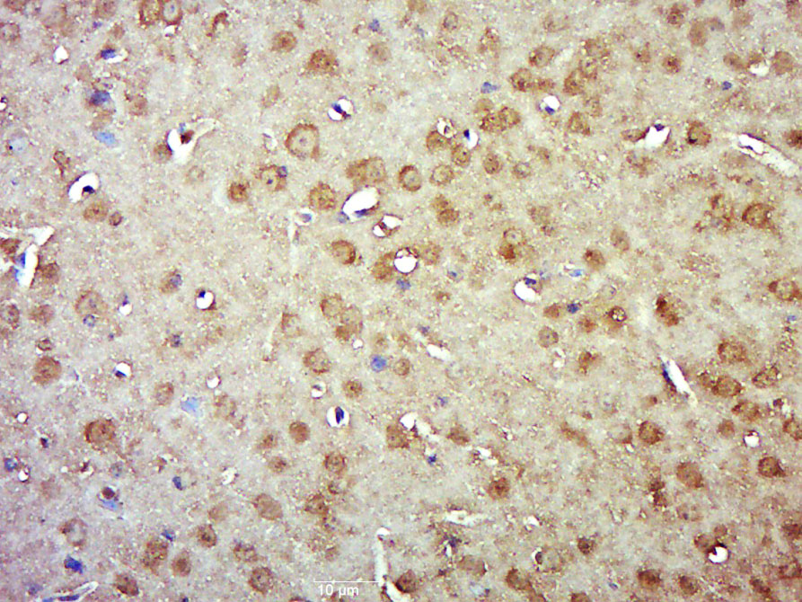 Paraformaldehyde-fixed, paraffin embedded (Mouse brain); Antigen retrieval by boiling in sodium citrate buffer (pH6.0) for 15min; Block endogenous peroxidase by 3% hydrogen peroxide for 20 minutes; Blocking buffer (normal goat serum) at 37°C for 30min; Antibody incubation with (SMG1) Polyclonal Antibody, Unconjugated (bs-12637R) at 1:500 overnight at 4°C, followed by a conjugated secondary (sp-0023) for 20 minutes and DAB staining.