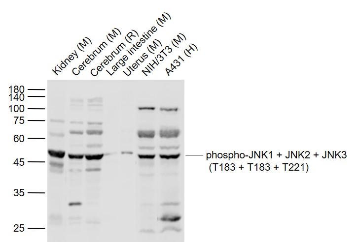 | 英文名称 | phospho-JNK1 + JNK2 + JNK3 (T183 + T183 + T221) Rabbit pAb |