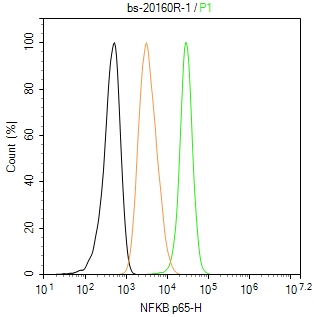 The HeLa (H) cells were fixed with 4% PFA (10 min at r.t.) and then permeabilized with 90% ice-cold methanol for 20 min at -20℃,the cells then were incubated in 5%BSA to block non-specific protein-protein interactions (30 min at r.t.), followed by secondary antibody incubation for 40 min at room temperature. Primary Antibody (green):Rabbit Anti-NFKB p65 antibody (bs-20160R,1:100); Isotype Control (orange): Rabbit IgG (bs-0295P). Blank control (black): PBS. Acquisition of 20,000 events was performed.